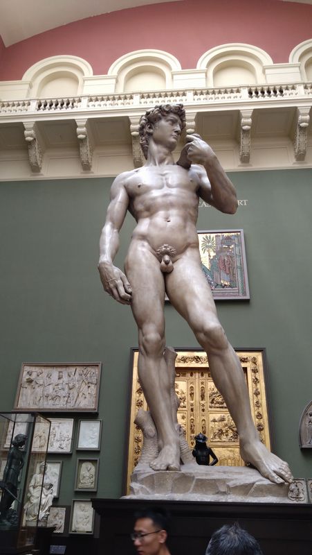 ヴィクトリア・アルバート博物館 + ショッピング Paddington → Sloane Square (Circle線) ヴィクトリア・アルバート博物館は10:00開館なので, その前に行きたかったみやげ物屋「パートリッジズ」に行く予定で探したが, 結局閉店. 歩いて, ヴィクトリア・アルバート博物館へ 多くの人が入場を待っていた. 中に入ると, 驚くばかりのコレクション. 世界中の古美術品, 「ダビデ像」のレプリカ, イタリアの天国の門のレプリカ, 宝石や工芸品のタペストリーなど多くの美術品が展示されていた. 2階から見たダビデ像