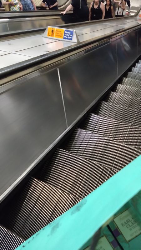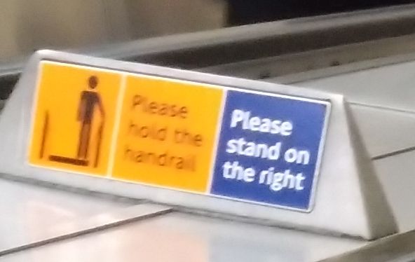 中華街で夕食を食べて, トイレに行ったときのドア. 引っ張れない. 押すのが正解 駅のエスカレータには, 右に立つように指示がしてある. 日本では, 「歩くな, 2列で乗れ」と言う自治体などがあるが, 片方に立って, 急ぐ人は他方を歩くのが自然だと思う. 表紙に戻る 前日 6月17日(月) ストーンヘンジとバース 翌 日 6月19日(水) ストラトフォート・アポン・エンヴォン |